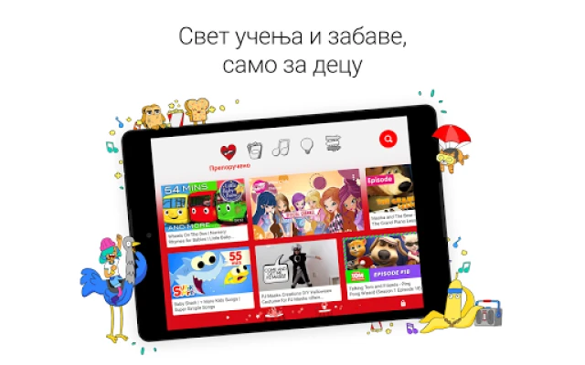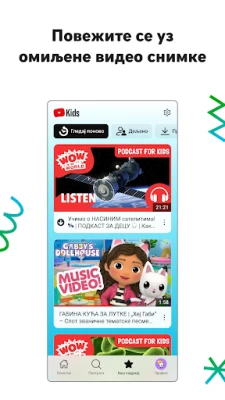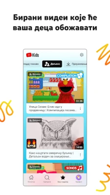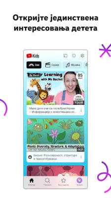 YouTube Kids pruža siguran prostor za decu da istraže video sadržaj koji vole, uz roditeljsku kontrolu. Pomozite im da otkriju jedinstvena interesovanja, razvijaju maštu i grade samopouzdanje kroz prilagođene profile i jednostavnu navigaciju.